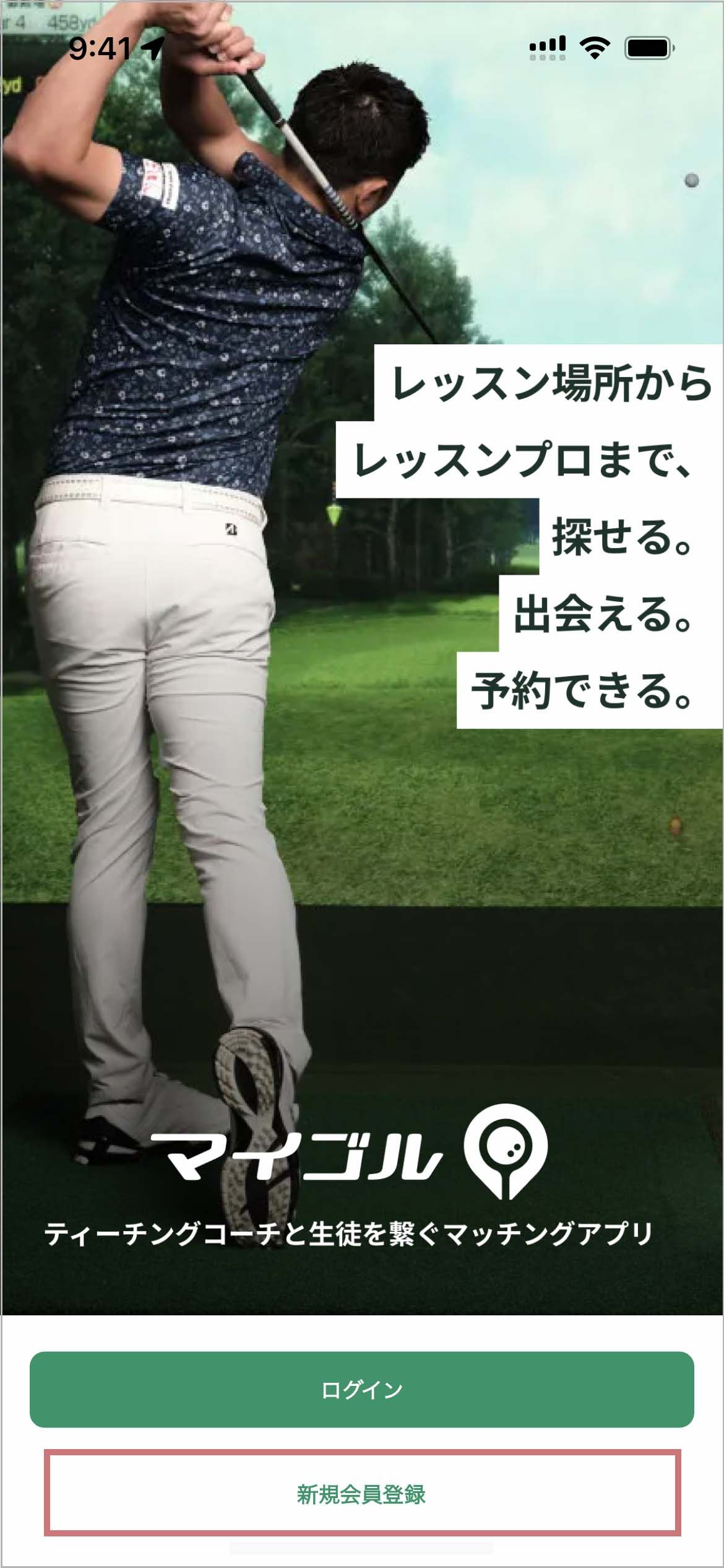 マイゴルアプリを開き「会員登録」をタップ「LINEでログイン」または「Sign in with Apple」を選択します