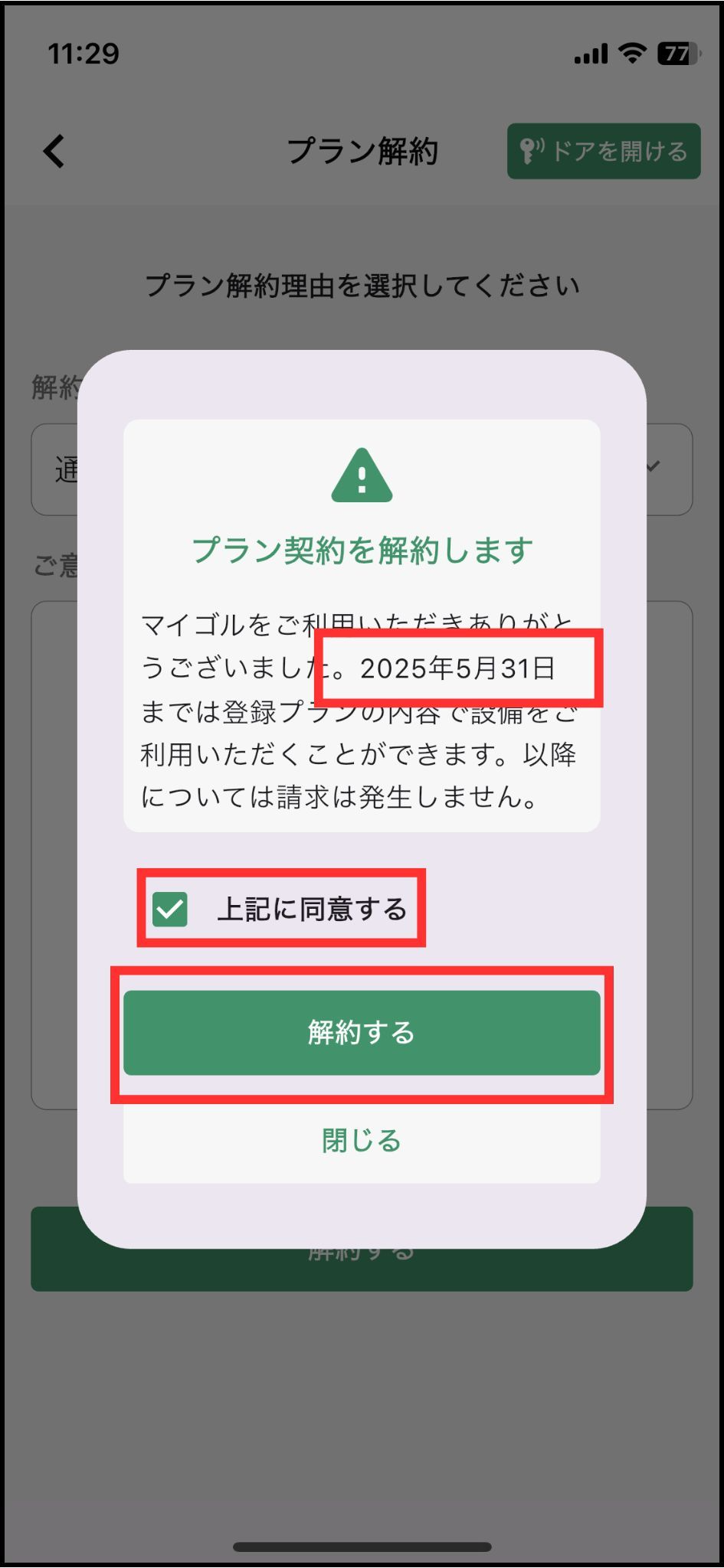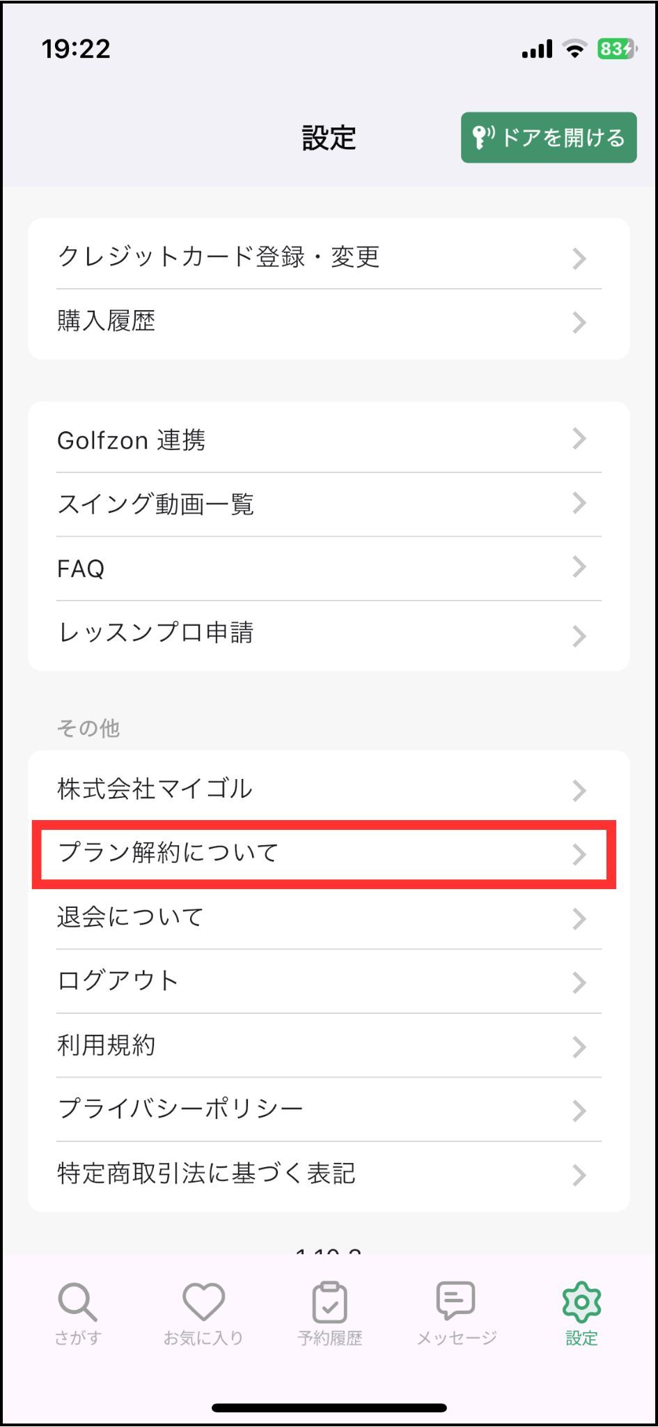 解約希望される場合は、解約希望月の前月末までにアプリにてお手続きが必要です※店舗ルールやプラン内容によっては一定期間解約ができない場合がございますお問い合わせご希望の方は、こちらからご連絡くださいキャンペーン内容によっては解約時に違約金を頂戴する場合がございます再入会の際には入会金・登録を頂戴いたします※1,100円/月で、プラン休会もご案内可能です1. マイゴルアプリを開き、「設定」をタップ2.下にスクロールして「プラン解約について」をタップ3. 解約理由を選択し、「解約する」のボタンをタップ4. 最終利用日を確認し、解約するのボタンをタップ5. 設定のページで「プラン解約予定日」が確認できます上記ご確認いただき、解決しない場合はこちらからお問い合わせください