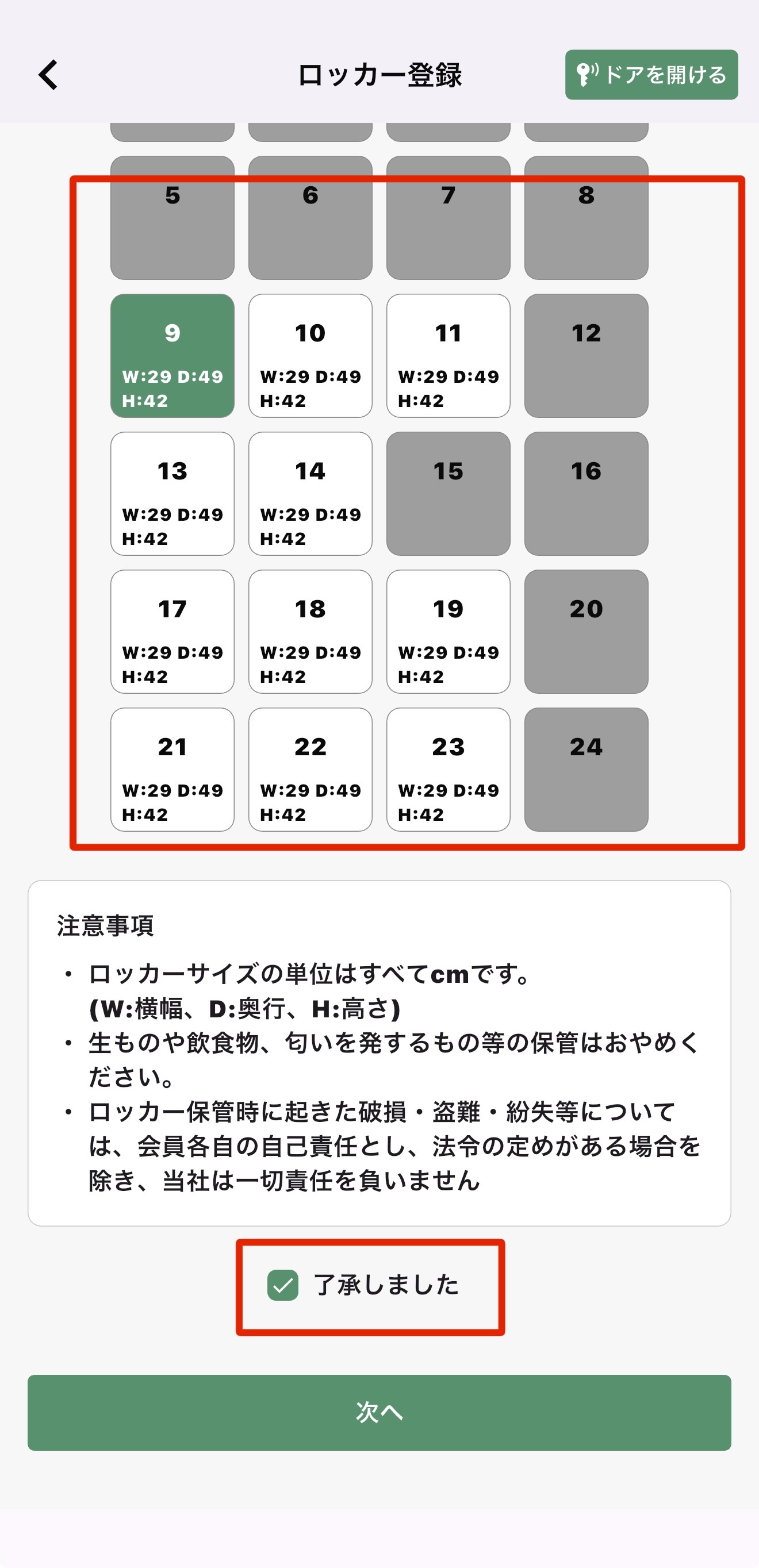 希望のロッカーを選択していただくと緑になります。
