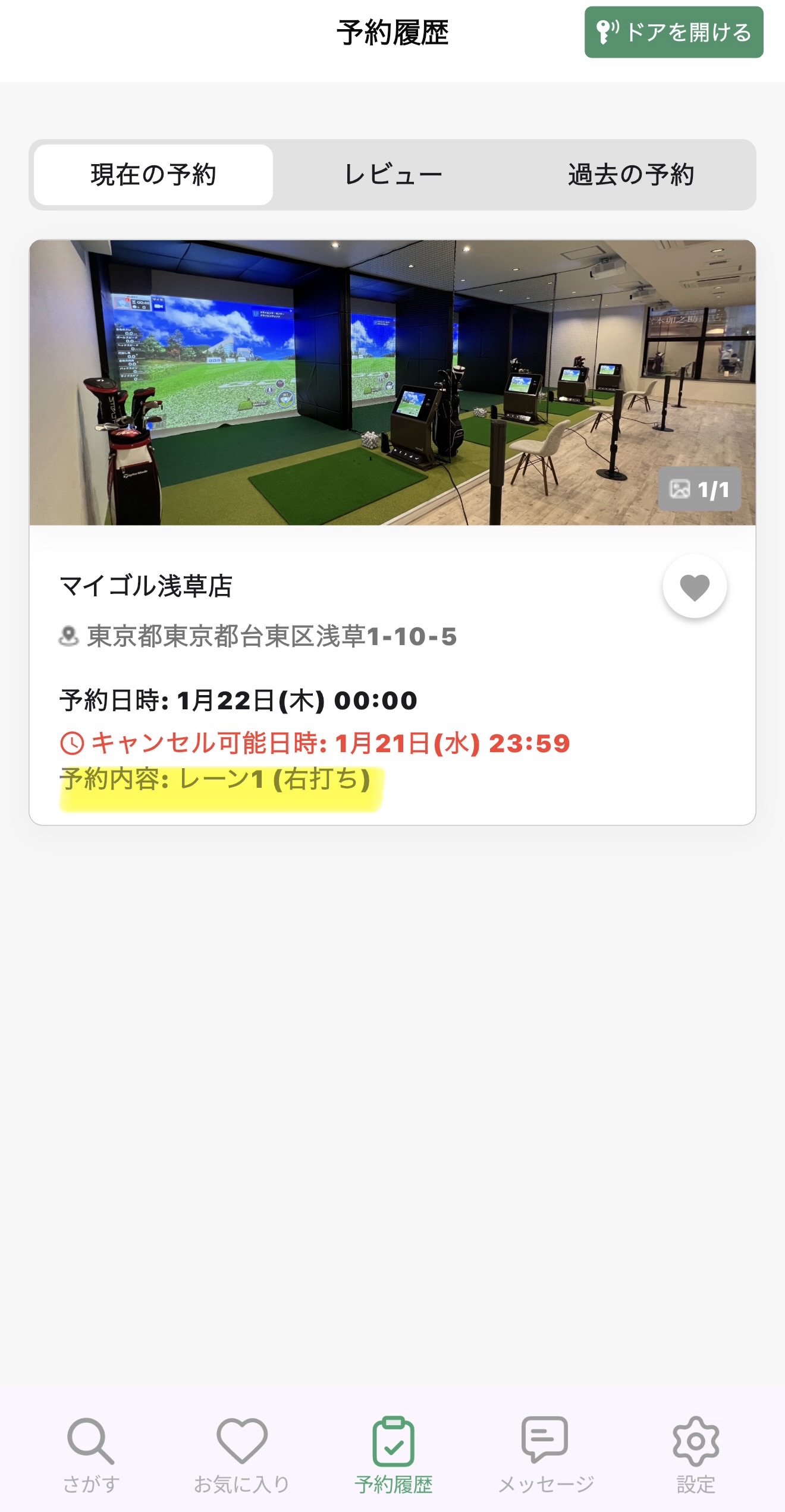 予約履歴からご自身が予約した打席番号をご確認ください。